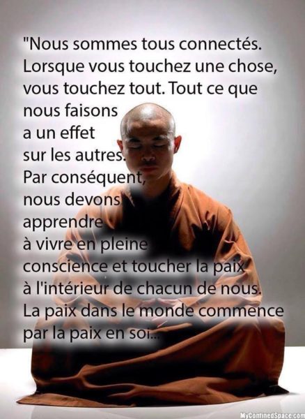 Nous sommes tous connectés. Lorsque vous touchez une chose, vous touchez tout. Tout ce que nous faisons à un effet sur les autres. Par conséquent, nous devons apprendre à vivre en pleine conscience et toucher la paix à l’intérieur de chacun de nous. La paix dans le monde commence par la paix en soi.