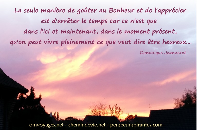 La seule manière de goûter au Bonheur est de l’apprécier et d’arrêter le temps car ce n’est que dans l’ici et maintenant, dans le moment présent, qu’on peut vivre pleinement ce que veut dire être heureux… – Dominique Jeanneret