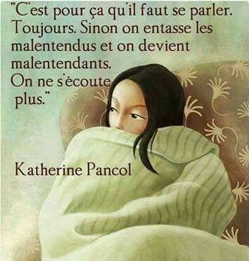 C’est pour ça qu’il faut se parler. Toujours. Sinon on entasse les malentendus et on devient malentendants. On ne s’écoute plus. – Katherine Pancol