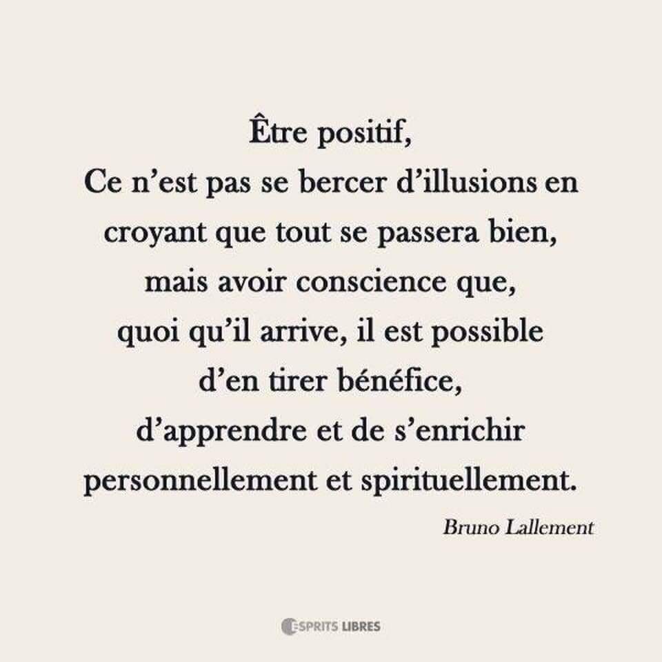 Être positif, ce n’est pas se bercer d’illusions en croyant que tout se passera bien mais avoir conscience que, quoi qu’il arrive, il est possible d’en tirer bénéfice, d’apprendre et de s’enrichir personnellement et spirituellement. – Bruno Lallement