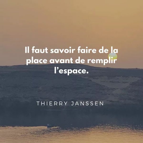 Il faut savoir faire de la place Publié par Dominique le 5 juillet 201829 juin 2018 Il faut savoir faire de la place avant de remplir l’espace. – Thierry Jansen Lire la suite Article précédent Un jour où j’étais tristeArticle suivant L’optimisme