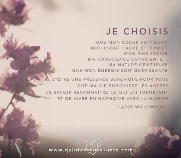 Je choisis que mon coeur soit doux, mon esprit calme et ouvert, mon âme solide, ma conscience consciente, ma nature généreuse, que mon énergie soit guérissante, d’être en présence bénéfique pour tous, que ma vie enrichisse les autres, de savoir reconnaître ce qui est important et de vivre en harmonie avec la nature. – Abby Williwroot