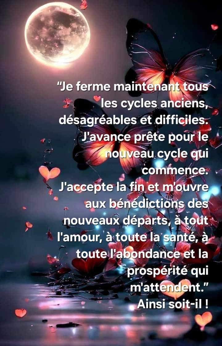 Je ferme maintenant tous les cycles anciens, désagréables et difficiles. J’avance, prêt(e) pour le nouveau cycle qui commence. J’accepte la fin et m’ouvre aux bénédictions des nouveaux départs, à tout l’amour, à toute la santé, à toute l’abondance et la prospérité qui m’attendent. Ainsi soit-il !