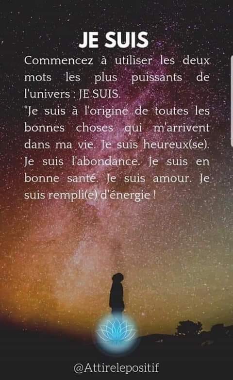 Je suis à l’origine de toutes les bonnes choses qui m’arrivent dans ma vie. Je suis heureux(se). Je suis l’abondance. Je suis en bonne santé. Je suis amour. Je suis rempli(e) d’énergie !