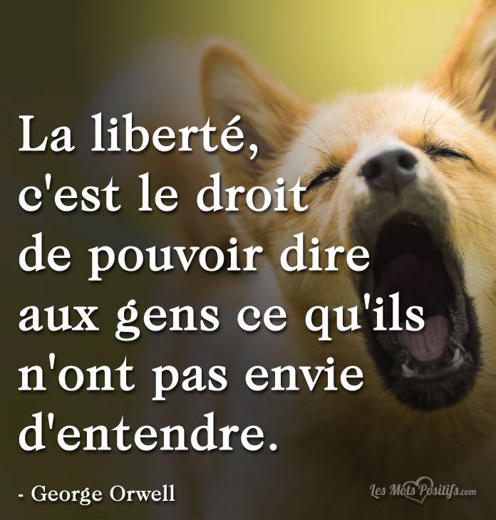 La liberté Publié par Dominique le 6 avril 201822 mars 2018 La liberté, c’est le droit de pouvoir dire aux gens ce qu’ils n’ont pas envie d’entendre. – George Orwell Lire la suite Article précédent Un jour viendraArticle suivant Si vous voulez vraiment