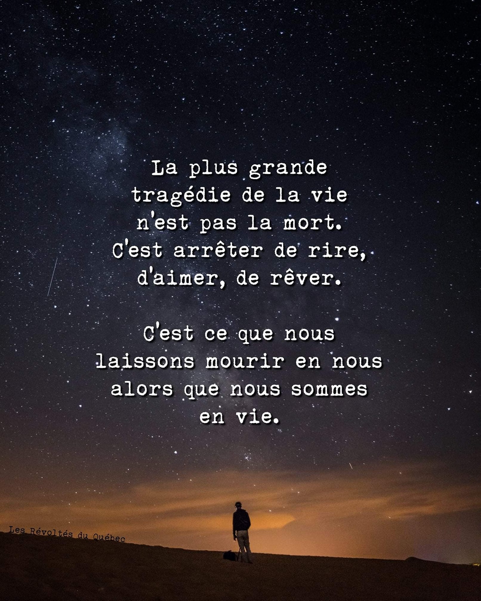 La plus grande tragédie de la vie n’est pas la mort. C’est d’arrêter de rire, d’aimer, de rêver. C’est ce que nous laissons mourir en nous alors que nous sommes en vie.