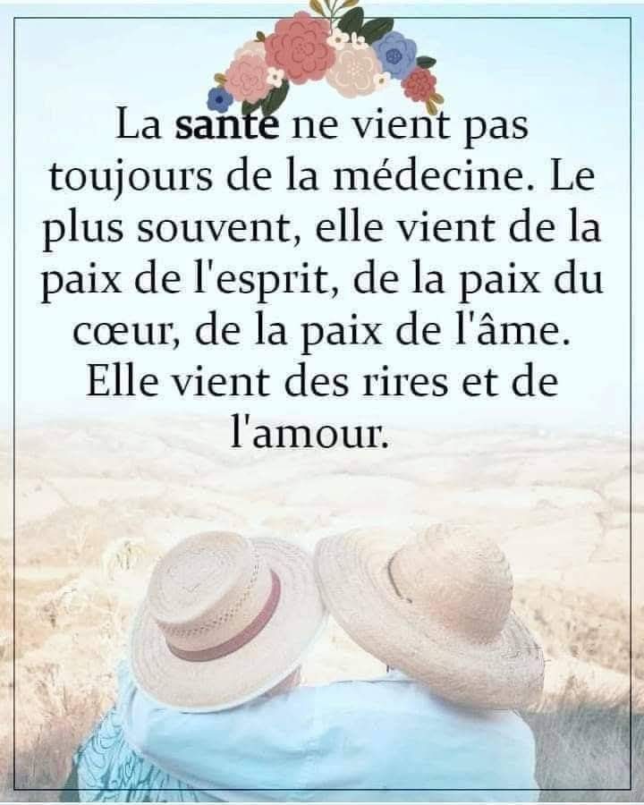 La santé ne vient pas toujours de la médecine. Le plus souvent, elle vient de la paix de l’esprit, de la paix du cœur, de la paix de l’âme. Elle vient des rires et de l’amour.