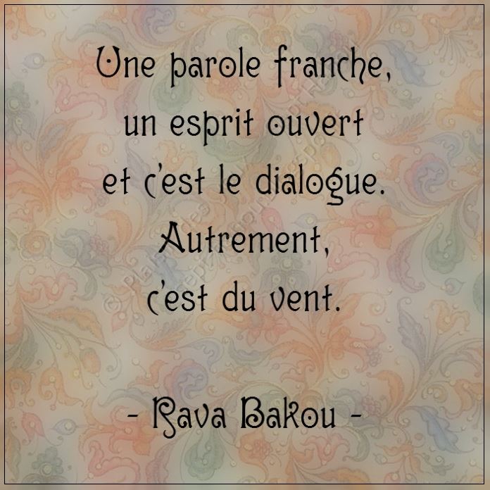 Le dialogue Publié par Dominique le 19 août 20154 août 2015 Une parole franche, un esprit ouvert et c’est le dialogue. Autrement, c’est du vent. – Rava Bakou . Lire la suite Article précédent Ton cheminArticle suivant Tes rêves