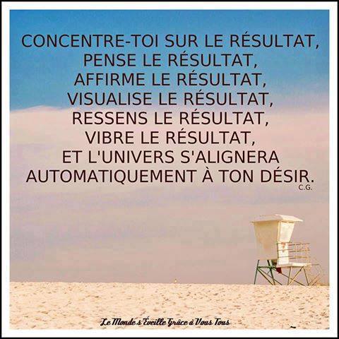 Concentre-toi sur le résultat, pense le résultat, affirme le résultat, visualise le résultat, ressens le résultat, et l’univers s’alignera automatiquement à ton désire. – C.G.