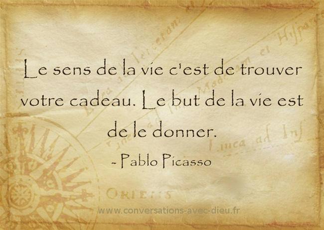 Le sens de la vie Publié par Dominique le 8 juin 20155 juin 2015 Le sens de la vie, c’est de trouver votre cadeau. Le but de la vie est de le donner. – Pablo Picasso . Lire la suite Article précédent Aimer le silenceArticle suivant Rentre en toi-même