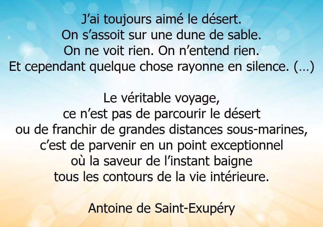 J’ai toujours aimé le désert. On s’assoit sur une dune de sable. On ne voit rien. On n’entend rien. Et cependant, quelque chose rayonne en silence. (…) Le véritable voyage, ce n’est pas de parcourir le désert ou de franchir de grandes distances sous-marines, c’est de parvenir en un point exceptionnel où la saveur de l’instant baigne tous les contours de la vie intérieure. – A. de St-Exupéry