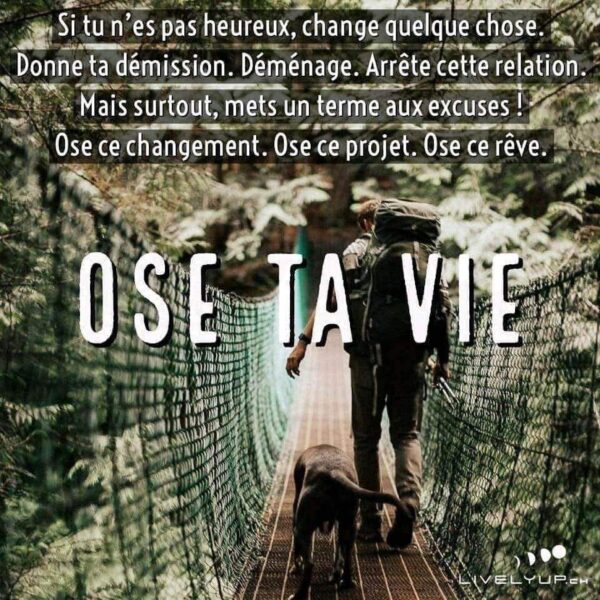 Si tu n’es pas heureux, change quelque chose. Donne ta démission. Déménage. Arrête cette relation mais, surtout, mets un terme aux excuses ! Ose ce changement. Ose ce projet. Ose ce rêve. Ose ta Vie !