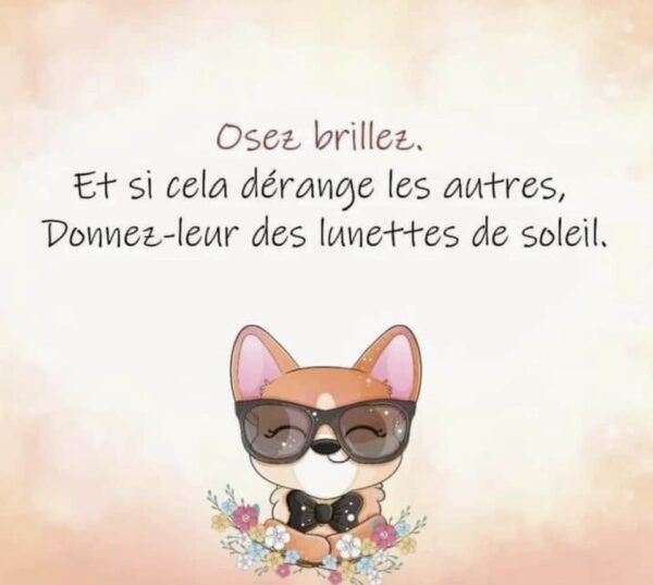 Osez briller Publié par Dominique le 6 avril 20242 avril 2024 Osez briller et, si ça dérange les autres, donnez-leur des lunettes de soleil. Lire la suite Article précédent La vie va finir par te donner ce que tu désiresArticle suivant Tout vient à point