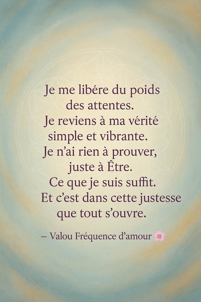 Je me libère du poids des attentes. Je reviens à ma vérité simple et vibrante. Je n’ai rien à prouver, juste à Etre. Ce que je suis suffit et c’est dans cette justesse que tout s’ouvre. – Valou