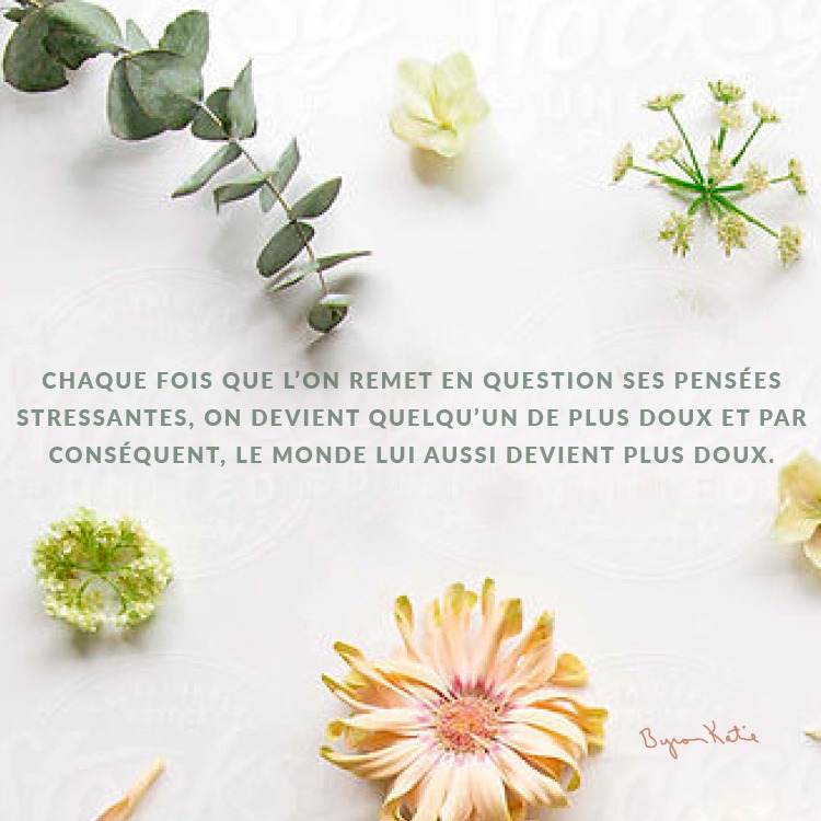 Chaque fois que l’on remet en question ses pensées stressantes, on devient quelqu’un de plus doux et, par conséquent, le monde lui aussi devient plus doux. – Byron Katie
