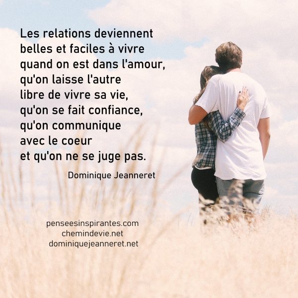 Les relations deviennent belles et faciles à vivre quand on est dans l’amour, qu’on laisse l’autre libre de vivre sa vie, qu’on se fait confiance, qu’on communique avec le coeur et qu’on ne se juge pas. – Dominique Jeanneret