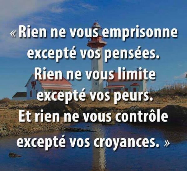 Rien ne vous emprisonne excepté vos pensées. Rien ne vous limite excepté vos peurs et rien ne vous contrôle excepté vos croyances.
