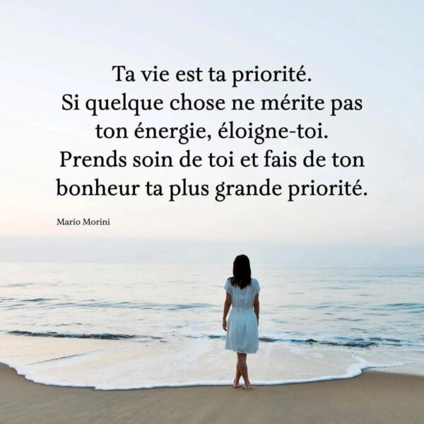 Ta vie est ta priorité. Si quelques chose ne mérite pas ton énergie, éloigne-toi. Prends soin de toi et fais de ton bonheur ta plus grande priorité. – Mario Morini