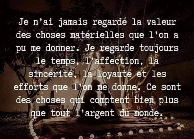 Je n’ai jamais regardé la valeur des choses matérielles qu’on a pu me donner. Je regarde toujours le temps, l’affection, la sincérité, la loyauté et les efforts que l’on me donne. Ce sont des choses qui comptent bien plus que…