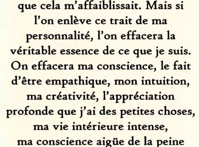 Auparavant, je détestais le fait d’être hypersensible. Je croyais que cela m’affaiblissait. Mais si on enlève ce trait de ma personnalité, on effacera la véritable essence de ce que je suis. On effacera ma conscience, le fait d’être empathique, mon…