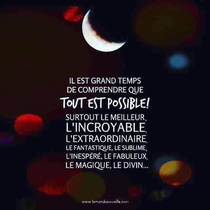 Il est grand temps de comprendre que tout est possible ! Surtout le meilleur, l’incroyable, l’extraordinaire, le fantastique, le sublime, l’inespéré, le fabuleux, le magique, le divin…