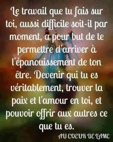 Le travail que tu fais sur toi, aussi difficile soit-il par moments, a pour but de te permettre d’arriver à l’épanouissement de ton être. Devenir qui tu es véritablement, trouver la paix et l’amour en toi et pouvoir offrir aux autres ce que tu es. – Au coeur de l’âme