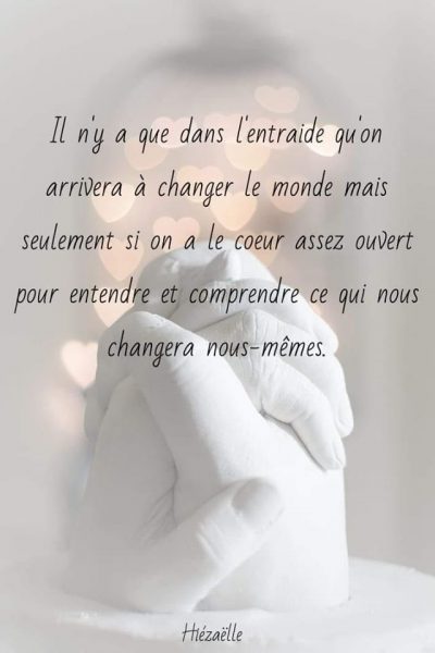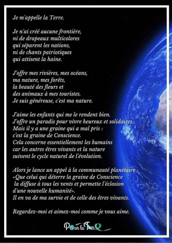 C’est un grand apprentissage pour certains mais ça en vaut la peine et c’est maintenant profondément nécessaire à un monde et une vie meilleurs. C’est comme si la Terre nous disait « Ça fait longtemps que je vous le disais, d’apprendre à vous aimer et à respecter la Vie, les autres, Moi, mais vous ne compreniez pas. Il est temps que vous regardiez la situation en face et que vous agissez en conséquence maintenant ! ».